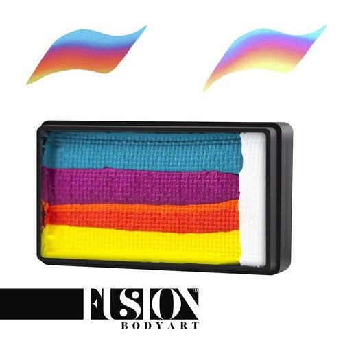 Fusion Body Art Double Dip Spectrum Cake Sugar Rush is een specialleke! Als je bij het laden van je penseel de witte strook mee neemt, zullen je kleuren pastel worden. Zo kan je de felheid van de kleuren aanpassen. Je kan de splitcake ook gebruiken om double-dip bloemen te maken.
