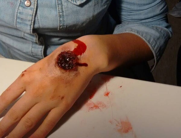 Vals bloed Stage Blood van Mehron is een theater attribuut. Stage Blood is een visceuze, levensechte, bijna ondoorzichtige vloeistof die niet toxisch is en zelfs zo veilig dat je het kunt eten. Stage Blood kun je gemakkelijk afwassen met water en zeep (maar test even op het ontstaan van vlekken in kleding voordat je het gaat gebruiken).