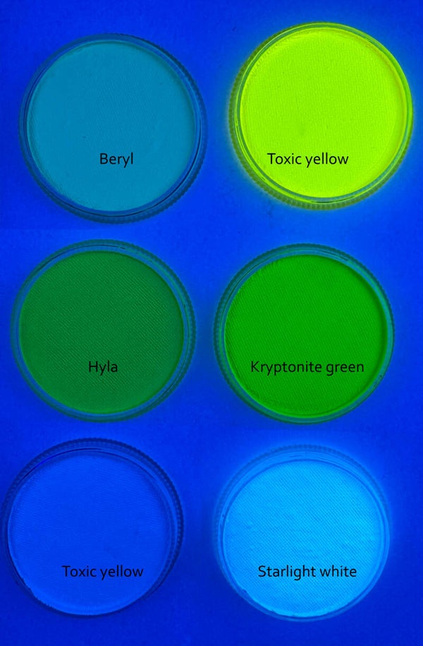 Deze intens gepigmenteerde schmink geeft een perfecte dekking en komt spectaculair tot leven onder blacklight. De kleuren lichten helder op zonder hun tint te verliezen, ideaal voor UV-acts, feesten of opvallende make-uplooks.