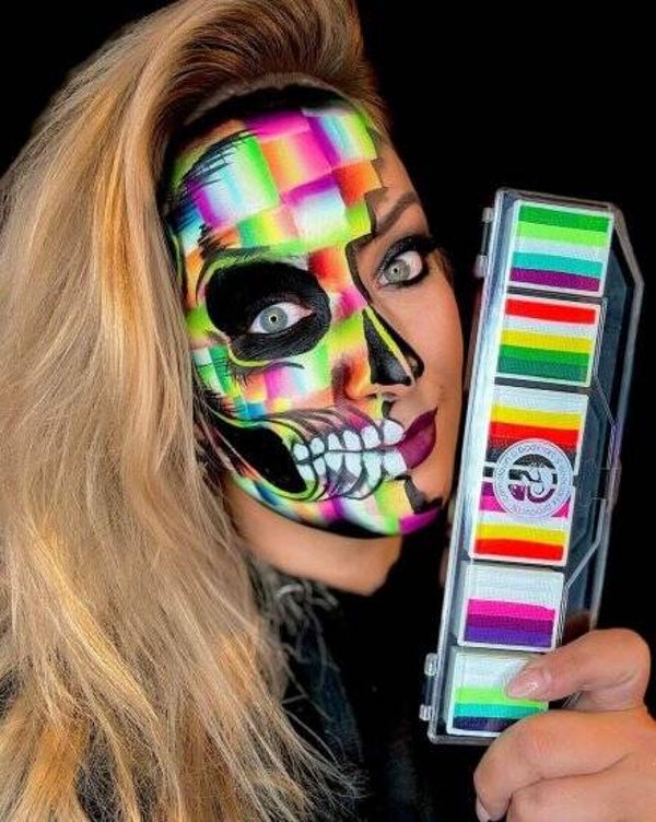 Maak de schmink licht vochtig met een penseel of spons — niet te droog, maar ook niet te nat. Een sprayflesje kan handig zijn om de cake gelijkmatig te bevochtigen. Zodra de schmink is aangebracht, blijft deze goed op zijn plek en behoudt hij zijn intense kleur (onder normale omstandigheden).